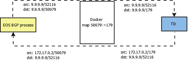 The last point is crucial, because TD will source BGP packets from the IP assigned to the Docker container (172.17.0.2). If EOS doesn’t have 172.17.0.2 configured as a BGP neighbor (even in shutdown state), the BGP process will reject packets from that IP.